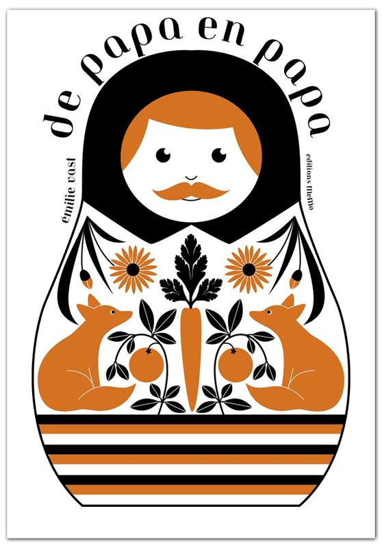 « Un jour,il y a très très très très longtemps, le papa du papa du papa du papa du papa du papa, vit naître le papa du papa du papa du papa du papa. » Ainsi commence cette longue histoire, qui de génération en génération, de papa en papa se rapproche de nous. Les poupées russes de plus en plus petites se déploient, chacune décorée d’animaux et de fleurs, chacune d’une couleur différente. Il y à très très très longtemps, il y a longtemps, il n’y a pas longtemps… et nous voilà ! Les illustrations délicates d’Émilie Vast se prêtent particulièrement bien à la décoration des poupées russes, dont les motifs ornent également la page de texte. La narration très simple faite de répétitions s’allège au fil du livre pour faire place à une conclusion très douce, qui remet l’enfant au centre de cette longue histoire. On a le plaisir de redonner leur place aux papas, qu’on oublie parfois… Les mamans leur répondent dans un livre jumeau.