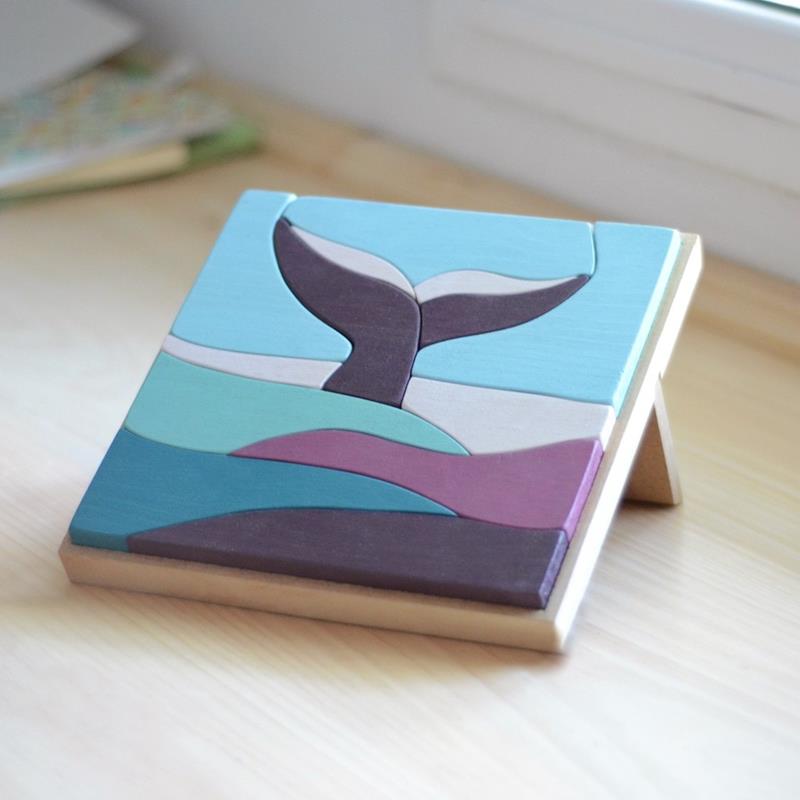 Descripción: 13 piezas irregulares de madera maciza que componen el paisaje de la cola de una ballena en el océano. Incluye bandeja/marco para poder guardar fácilmente el puzzle o bien utilizar como objeto decorativo (inclinación de la bandeja en dos posiciones)