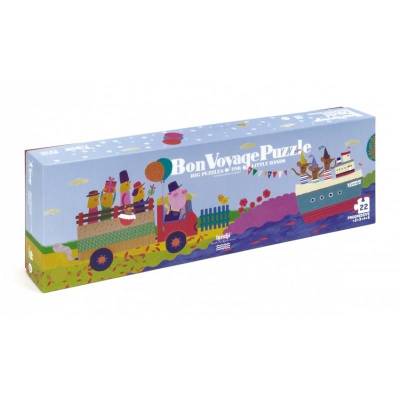 Un puzzle progresivo con figuras de 2, 3, 4 y 5 piezas que a su vez encajan dentro de un fantástico escenario de 8 piezas. Un puzzle muy grande para manos pequeñas.