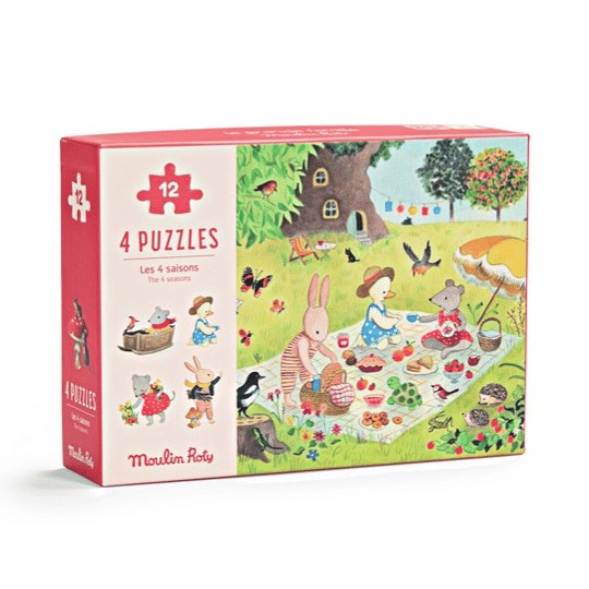 Descubre los cambios de la maravillosa madre naturaleza con estos 4 puzzles de las Estaciones del año junto a los dulces personajes de La Gran Familia de Moulin Roty.