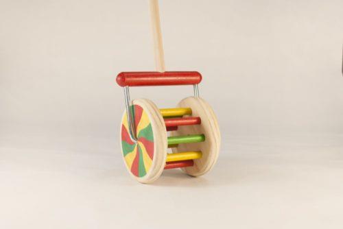 Rodari de fusta que consisteix en un pal i una nòria de colors vius amb una boleta de fusta a l’interior que produieix un so molt bonic al rodar.