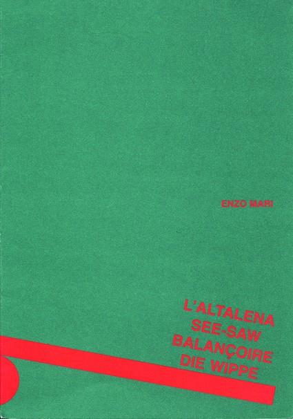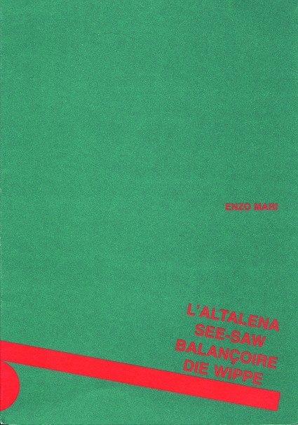 The Swing can be either a book, a game or an entertaining strip to hang up. The concertina-fold pages are full of black and brown stylised animals that chase one another, overlap, leap with their "heavy bodies" onto the ends of the simplest of swings trying to keep their balance. A brightly coloured red and green cover envelops cumbersome elephants, sinuous snakes and statuesque kangaroos. The book does not have words and speaks conceptually to children of quantity, shapes, weight and balance. The first ideas for this book (the limited edition) date from 1961.