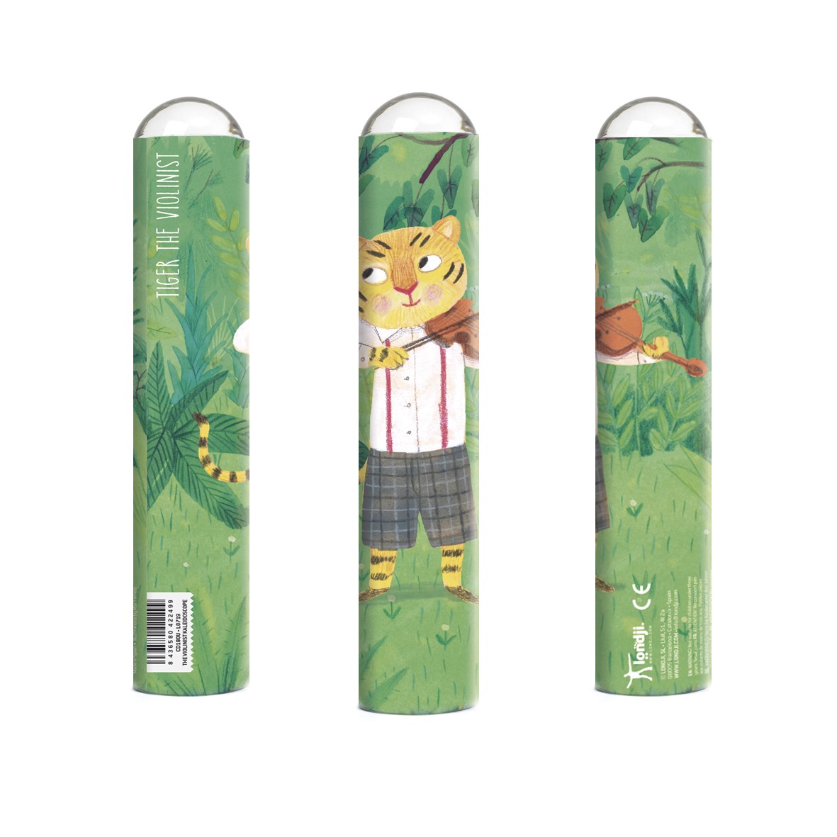 A diferència del calidoscopi clàssic el teleidoscopi descompon les imatges reals de l'exterior en formes calidoscòpiques. Il·lustració Nathalie Ouederni Material Cartró i mirall Mides Diàmetre 3,8 cm; alçària 19,4 cm Pes 0,080 kg