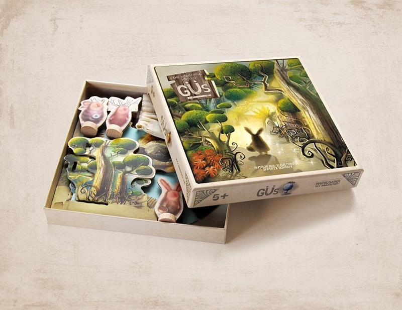 Contenido del juego: 1 tablero con un bosque giratorio 3D, 4 Güs, 1 Morc, 4 criaturas del bosque, 14 cartas con recetas, 1 dado, 24 cristales de colores