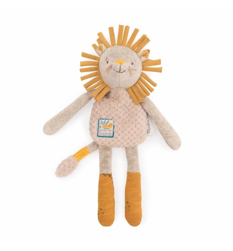 Este doudou-sonajero, de tacto muy suave, le sacará más de una carcajada a tu Bebé que se divertirá sacudiéndolo y descubrirá con asombro el sonido producido por las pequeñas bolas escondidas en la cabeza del León.
