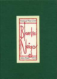 La magie du conte de Blanche-Neige s' opère à travers le miroir qui répond fidèlement aux questions de la méchante reine. Warja Lavater a su restituer sous forme de symboles la trame dramatique de l'histoire. Les couleurs et les formes illustrent les moments tragiques, magiques ou merveilleux de l'intrigue. Le symbole décrivant Blanche-Neige s' applique à représenter "La chevelure noire comme l'ébène, les lèvres rouges comme le sang et la peau blanche comme la neige" que souhaitait sa mère, pour elle, lors de son désir d' enfant.