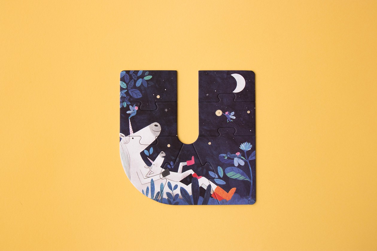 A d'aligator, E d'elephant, I d'iguana, O d'octopus, U de unicorn.5 acolorits puzzles per aprendre les vocals i els noms d'alguns animals en anglès.Il·lustració Sandra de la PradaEdat De 3 a 6 anysMaterial Paper i cartró reciclatPackaging Caixa de cartró rígid