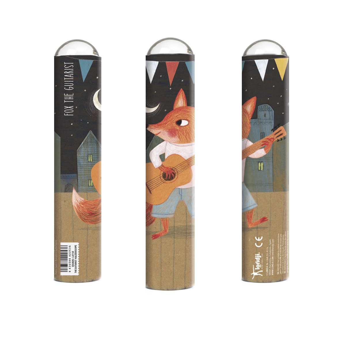 A diferència del calidoscopi clàssic el teleidoscopi descompon les imatges reals de l'exterior en formes calidoscòpiques. Il·lustració Nathalie Ouederni Material Cartró i mirall Mides Diàmetre 3,8 cm; alçària 19,4 cm Pes 0,080 kg