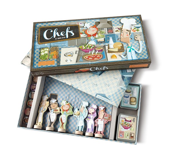 Contenido: 1 tablero, 6 figuras cocineros, 6 cartas chef, 1 carta primer jugador, 3x6 discos marcadores de acción, 6 × 10 cartas ingredientes, 29 cartas de recetas