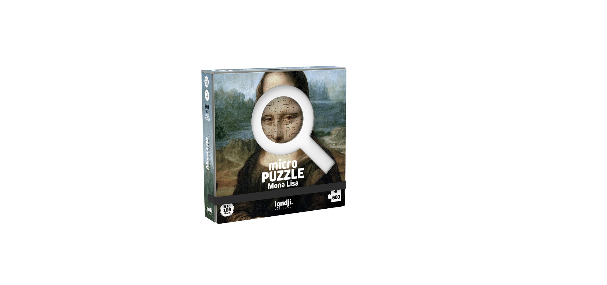 Un micropuzle de 600 peces de Mona Lisa.Il·lustració Leonardo DavinciEdat de 6 a 106 anysMaterial Paper i cartró reciclatPackaging Caixa de cartró rígidMides 20 x 30 cmMides caixa 14,5 x 14,5 x 3,5 cm