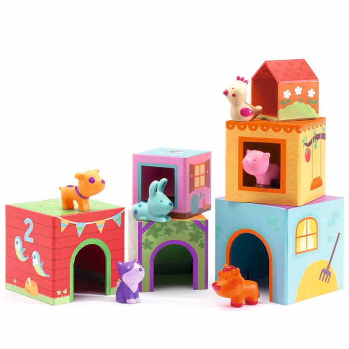 Cubos de cartón de distintos tamaños con animales de juguete que se integran perfectamente en cada uno de ellos. Los más pequeños pueden jugar a apilar los cubos, asociar cada animal con su casita, ordenar los cubos según los números que aparecen en cada casita, hacer construcciones, inventar historias, etc.