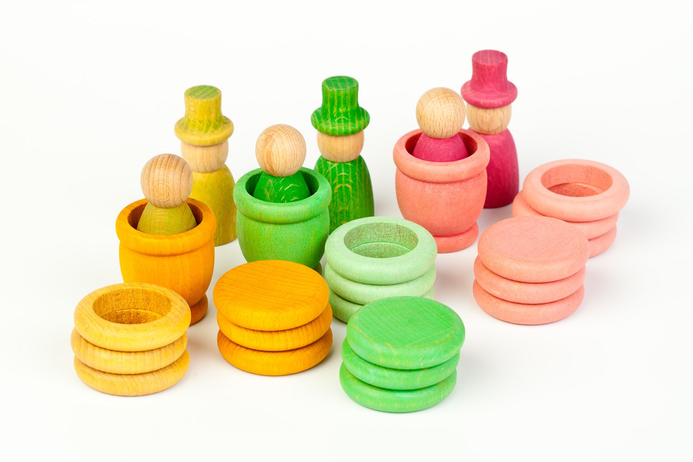 Conté: 3 nins, 3 nins amb barret, 3 mates, 9 anelles, 9 monedes