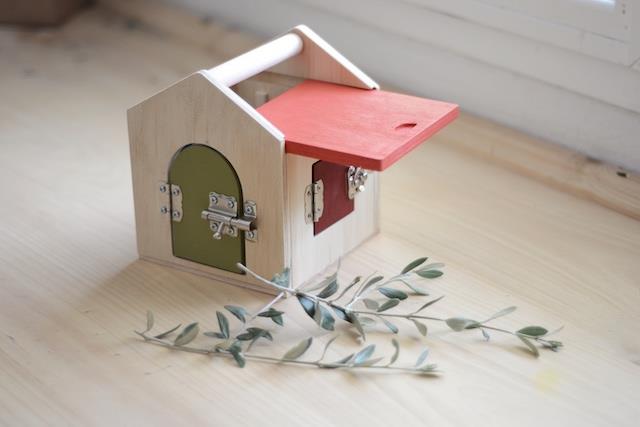 Casita de cerraduras y caja de permanencia inspirada en el concepto de vida práctica de la Dra. María Montessori. Realizada en madera terciada, dispone de cuatro puertas con cerrojos diferentes y un tejado deslizante. Además incluye un asa para que la puedan transportar facilmente.