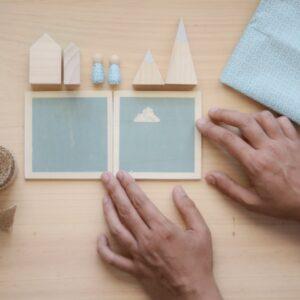 Descripción: Escenario plegable de pequeño formato decorado con ilustraciones estampadas con transferencia en madera. Dos muñecos despersonalizados vestidos con papel estampado de producción artesana y método de fabricación tradicional y ecológica. Dos montañas y dos casitas de madera completan el conjunto.