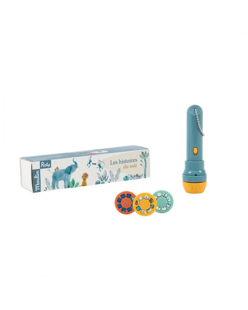 Estas historias de Moulin Roty para la linterna de proyección enamorarán a los peques enseguida. Podrán convertir su habitación es un super cine. Primero debes poner uno de los 3 discos en la linterna y después apuntar hacia la pared o donde queramos proyectar el cuento y... ¡voilà! ya estamos listo...
