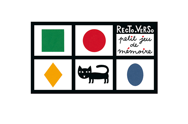 PASCALE ESTELLON a créé un jeu de cartes qui s’apparente à un jeu de memory, mais fait appel à l’esprit de déduction en plus de l’observation et de la mémoire. Sur une face de la carte, une forme géométrique en couleur – carré, rond, triangle, spirale, ovale et losange – Sur l’autre face, une image noir et blanc. Le lien entre les deux est la similitude de forme, comme arbre/carré ; pomme/rond; spirale/serpent… Des dessins très graphiques et des couleurs simples aident l’enfant à établir le lien entre la forme et l’image. Un maître de jeu pose les questions, muni d’un petit guide où figurent toutes les réponses. On peut l’utiliser dans les deux sens, partir de la forme géométrique pour deviner l’objet/animal… ou deviner la forme géométrique au verso de la face illustrée.