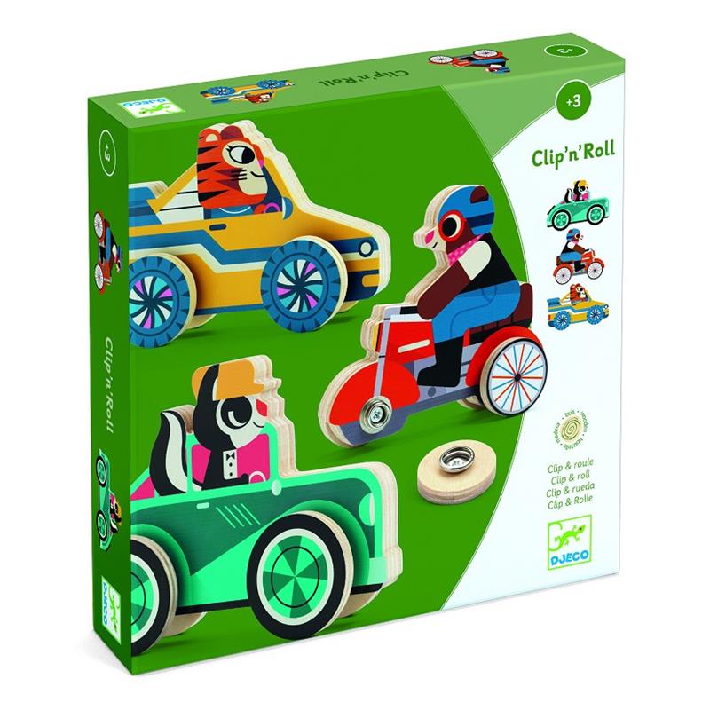Clip'n'Roll és un joc de muntar amb clip. Posa-li rodes als tres bòlids de fusta perquè puguin rodar. Munta amb un clip els vehicles de fusta i fes-los rodar
