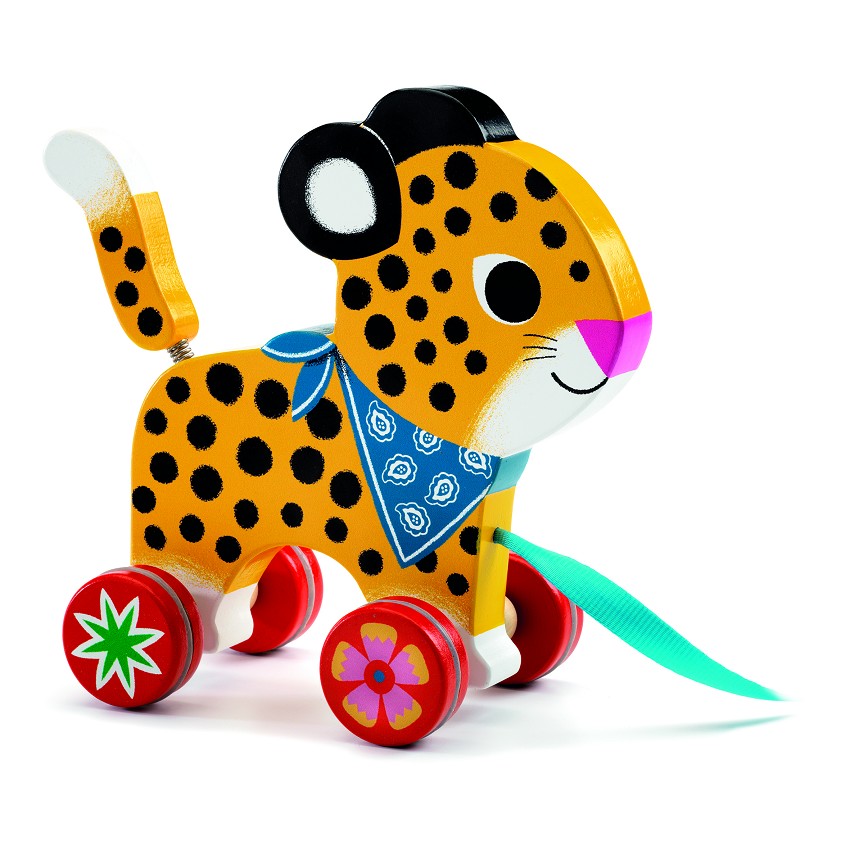 Arrastre de madera con cuerda de tela, con forma de leona.Sus colores y su dulce rostro le harán un buen compañero de viaje de vuestro hijo. Medidas: 14 x 12 x 8 cmPresentado en bonita caja