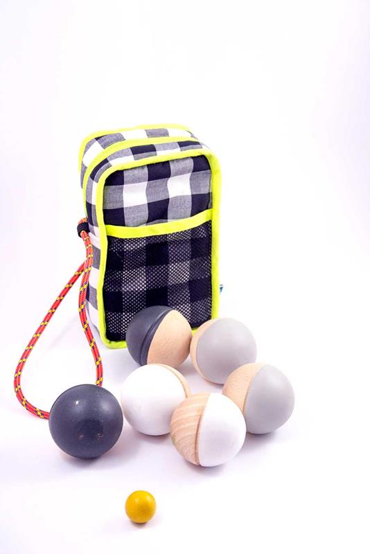 Juego de petanca con 6 bolas y un boliche de madera.Incluye instrucciones, bloc para anotar puntuaciones y bolsa con forro flúor impermeable.Un set de petanca muy «cool» para gozar de este juego que emociona a todas las edades.