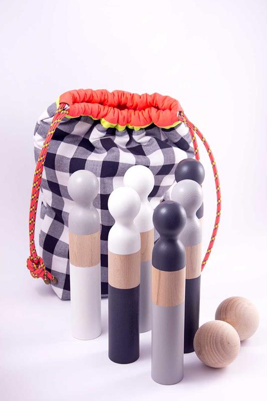 Juego de 6 bolos de madera de haya de 28 cm de alto y 2 bolas.Incluye mochila-petate con forro fluor impermeable.