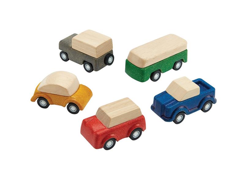 Take a ride around the city with the New PlanWorld Cars! Designed using a unique combination of solid wood and PlanWood, this play set includes 5 different vehicles: a grey wagon, red SUV, yellow car, green bus and blue truck.