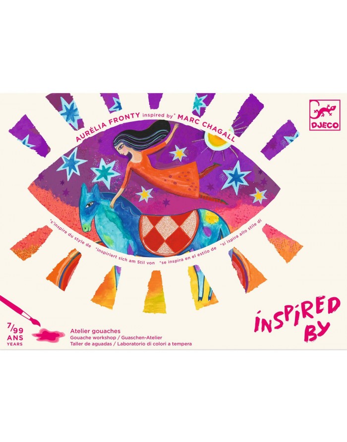 Actividad de pintura con ilustraciones inspiradas en el estilo del gran maestro surrealista Marc Chagall.El niño agrega colores mediante toques y los superpone para revelar los secretos de estos personajes que flotan en el aire.Recomendado desde los 7 años.Témpera muy pigmentada de colores vibrantes...