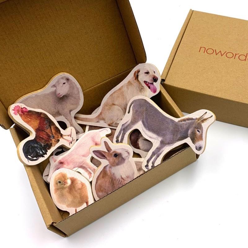 Diez imanes en madera de bambú con imágenes reales de animales de la granja impresas directamente sobre la superficie de bambú.Para colocar sobre cualquier superficie metálica.Incluye: caballo, gallo, oveja, pollito, conejo, vaca, perro, pato, burro y cerdito