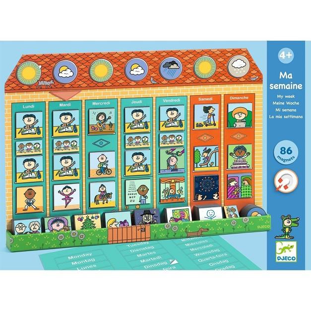 Un divertido juego en familia para aprender a decir la hora y planificar las actividades de la semana. Los complejos conceptos de pasado, presente y futuro se convierten en una parte sencilla de la vida cotidiana de tu hijo. Un montón de imanes: escenas cotidianas, actividades deportivas o artísticas, eventos habituales o especiales, el tiempo... para que puedas ir colocándolos una y otra vez en la pizarra magnética. Imanes sobre los que puedes dibujar y personalizar hasta el último detalle. Pegatinas con los días de la semana en 4 idiomas. ¡Momentos compartidos para entender claramente cómo pasa el tiempo!