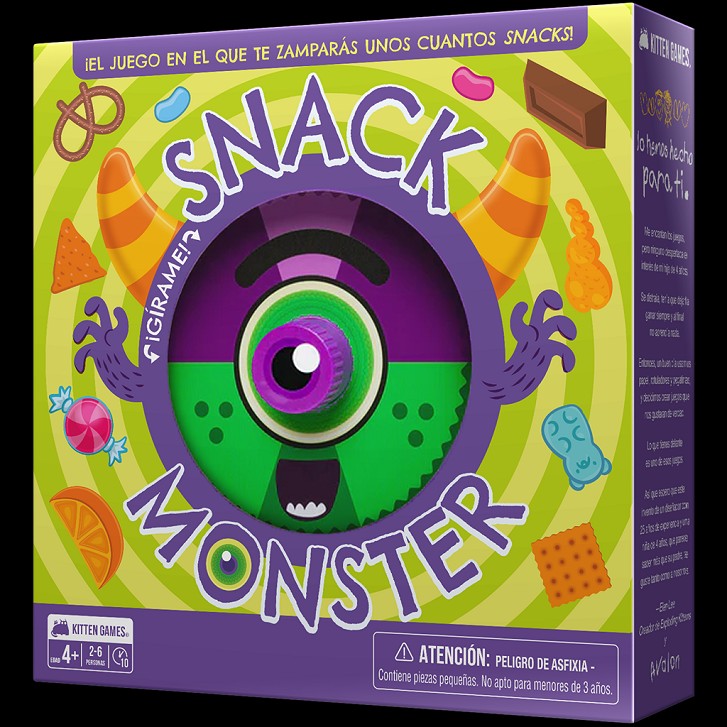 ¡El juego en el que te zamparás unos cuantos snacks!1 ¡Prepara los Snacks que más te gusten! ¿Cómo? ¿Que no tienes ninguno? ¡No te preocupes! Esta caja contienetodo lo que necesitas para jugar.2 Haz girar al Giramonstruo para que luego alguien lo pare con su dedo.3 Ganarás Snacks, también los perder...