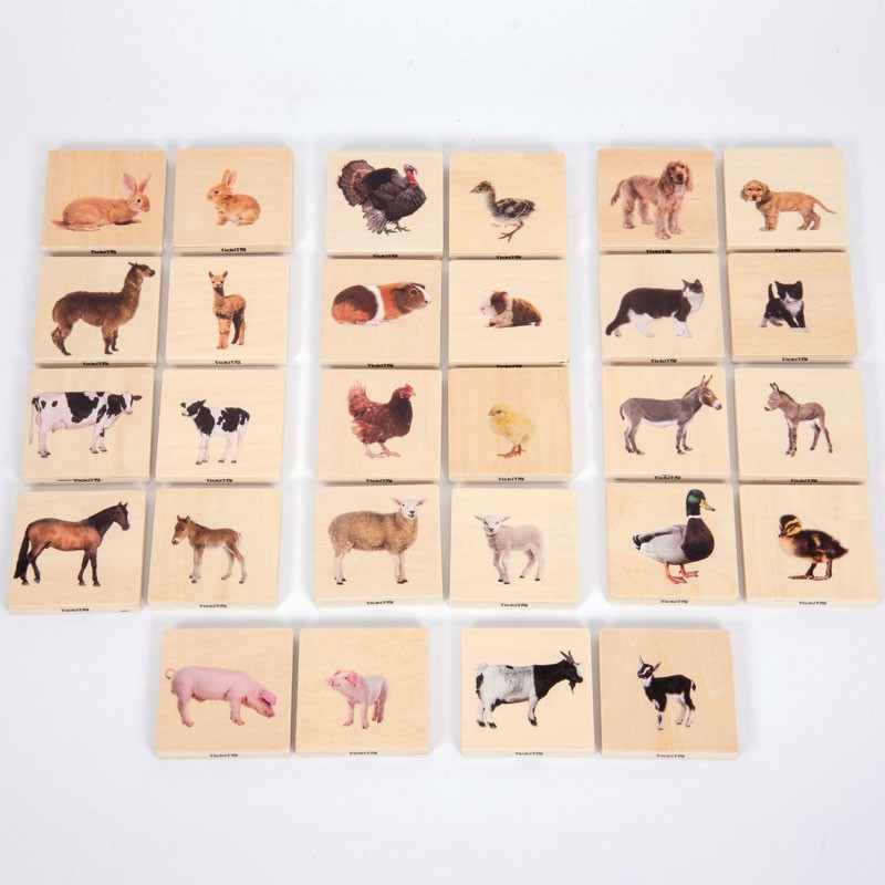 Un juego de madera divertido y versátil, nuestro tickit® El juego de emparejamiento de animales domésticos es un conjunto de catorce pares de azulejos de contrachapado de tilo suave y táctil, con una impresión a color clara en un lado de imágenes fotográficas reales de animales domésticos adultos y sus crías. Los azulejos cuadrados y gruesos son fáciles de sostener y voltear en las manos de su hijo.