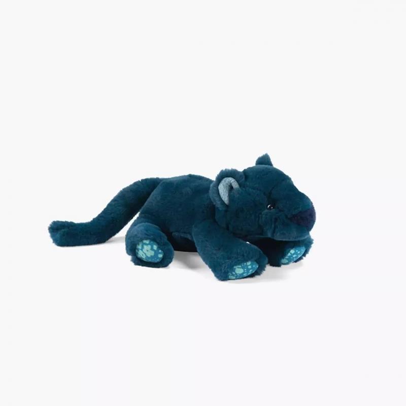 ¡Pequeña pantera con orejas brillantes, equipada con almohadillas de jacquard, lista para saltar y ser abrazada! Un compañero sacado de la selva con un color increíble para imaginar tiernas aventuras. Se encuentra en posición acostada.Desde el nacimiento, para todas las edades.
